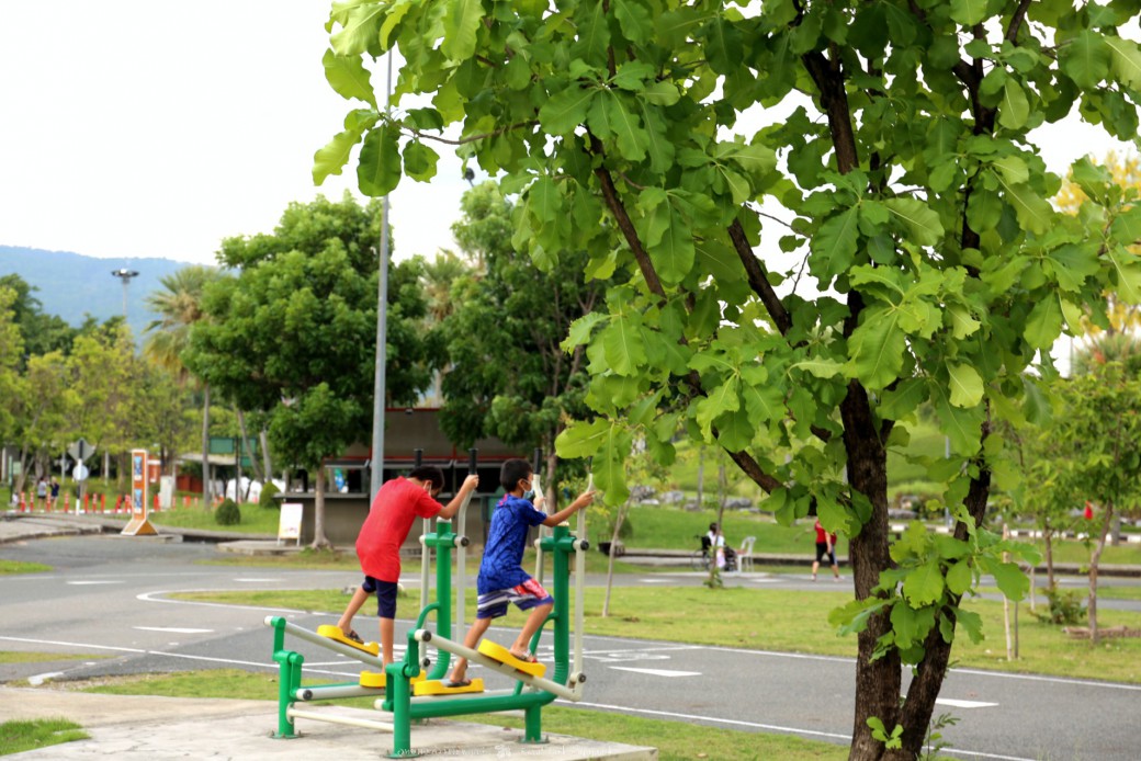 พื้นที่ออกกำลังกายล้อมรอบไปด้วยต้นไม้สีเขียว