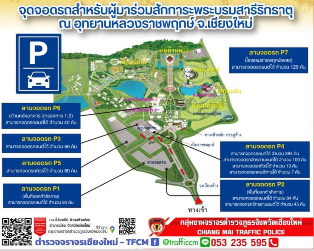 ⛟ จุดจอดรถ จะมี 2 จุด คือ ลานจอดรถอุทยานหลวงราชพฤกษ์ รองรับได้ 700 คัน และ ที่จอดรถคณะสัตวแพทย์ คณะเกษตร มช. จอดได้ 1,500 คัน โดยจะมีรถรับ-ส่งอำนวยความสะดวก