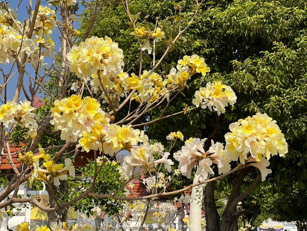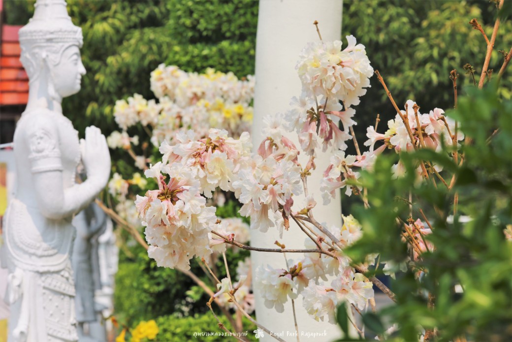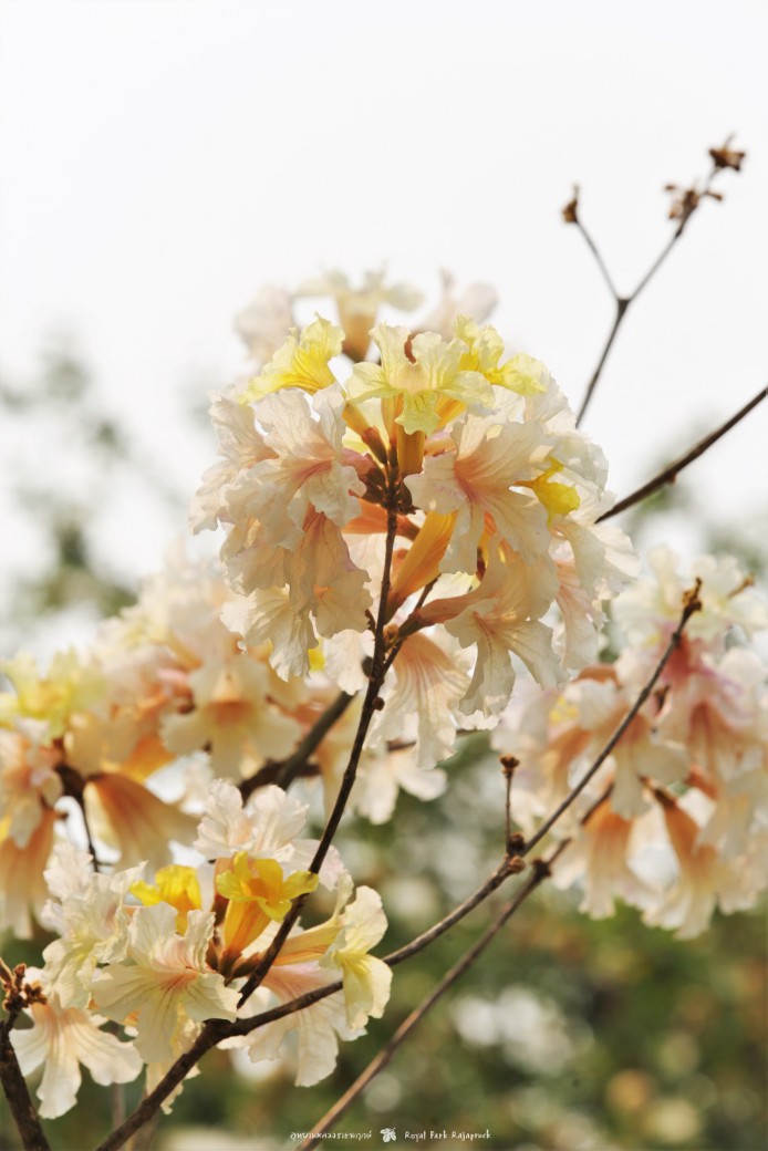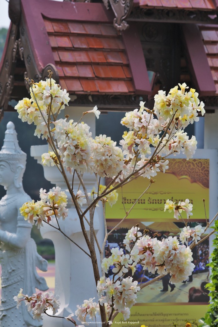 ด้วยความสวยงามและโดดเด่นของดอกทรัมเป็ตสายพันธุ์ใหม่ ที่มีเฉดสีโทน “เหลือง-ม่วง-ขาว” เป็นที่สะดุดตากับผู้พบเห็นเป็นอย่างมาก “1 ปีบานเพียง 1 ครั้ง”ในช่วงเดือนมีนาคมของทุกปี (ระยะเวลาบานประมาณ 10-15 วัน) และเป็น "ครั้งแรกที่บานสะพรั่งทุกต้น" ตลอดเส้นทางเดินบริเวณลานราษฎร์รักบาทมุ่งสู่หอคำหลวง..ช่วงนี้ใครที่เดินทางเข้าร่วมสักการะพระบรมสารีริกธาตุและพระอรหันตธาตุฯ ก็ห้ามพลาดที่จะชื่นชมและเก็บภาพความสวยงามของดอกทรัมเป็ตสายพันธุ์ใหม่ของอุทยานหลวงราชพฤกษ์