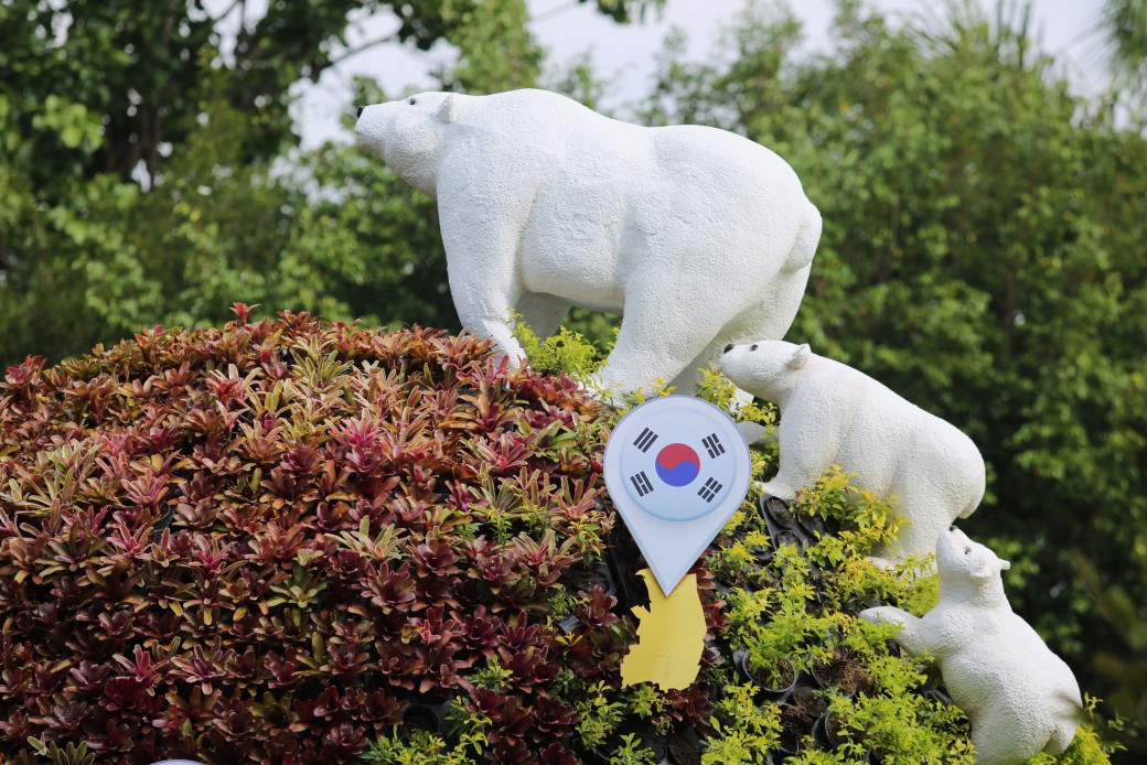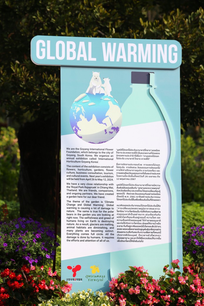 ในแนวคิดการเปลี่ยนแปลงสภาพภูมิอากาศและภาวะโลกร้อน โดย มูลนิธิไม้ดอกไม้ประดับนานาชาติโกยาง ประเทศเกาหลีใต้ที่ได้ร่วมจัดแสดงที่สวนสวัสดี อุทยานหลวงราชพฤกษ์ จังหวัดเชียงใหม่ ซึ่งความหมายของประติมากรรมไม้ดอกไม้ประดับนั้น ได้สื่อถึงภาวะโลกร้อนที่เกิดขึ้นในปัจจุบันนี้ สาเหตุหลักมาจากมนุษย์ได้ทำลายธรรมชาติก่อให้เกิดความเสียหายต่อธรรมชาติเป็นอย่างมาก ก่อให้เกิดภาวะโลกร้อน ส่งผลให้ธารน้ำแข็งละลาย ถิ่นที่อยู่อาศัยของหมีขั้วโลกและสัตว์ต่างๆ ลดลง เช่นเดียวกันกับหมีขั้วโลกที่เราเห็นอยู่ตอนนี้ที่ต้องอพยพจากถิ่นฐานที่ตัวเองเคยอยู่เพื่อความอยู่รอด