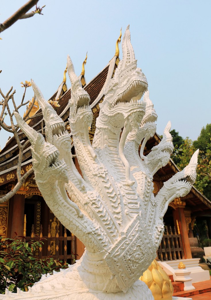 ด้านหน้าของวัดจะมีรูปปั้น “พญานาค 7 เศียร” สีขาวอร่ามตา น่าเกรงขามซึ่งเป็นตำนานของพญาศรีสัตตนาคราช มีความเด่นสง่า มี 7 เศียร ลำตัวเดียว เป็นตระกูลพญานาคที่สืบสายพันธุ์มาตั้งแต่สมัยพุทธกาล มีความใกล้ชิดพระพุทธองค์และพระพุทธศาสนา เป็นผู้ปกป้องชาวลาวและผู้อาศัยอยู่ริมน้ำโขง