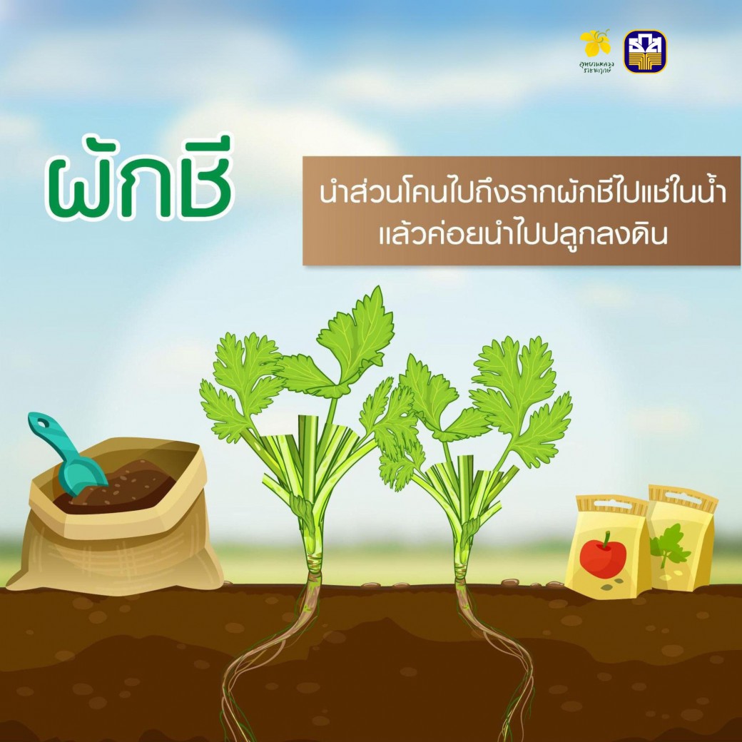 นำโคนต้นส่วนล่างที่มีรากไปแช่ในน้ำ เเล้วค่อยนำไปปลูกลงดิน จากนั้นเราก็แค่รอเด็ดใบอ่อนๆ นำไปทำอาหาร
