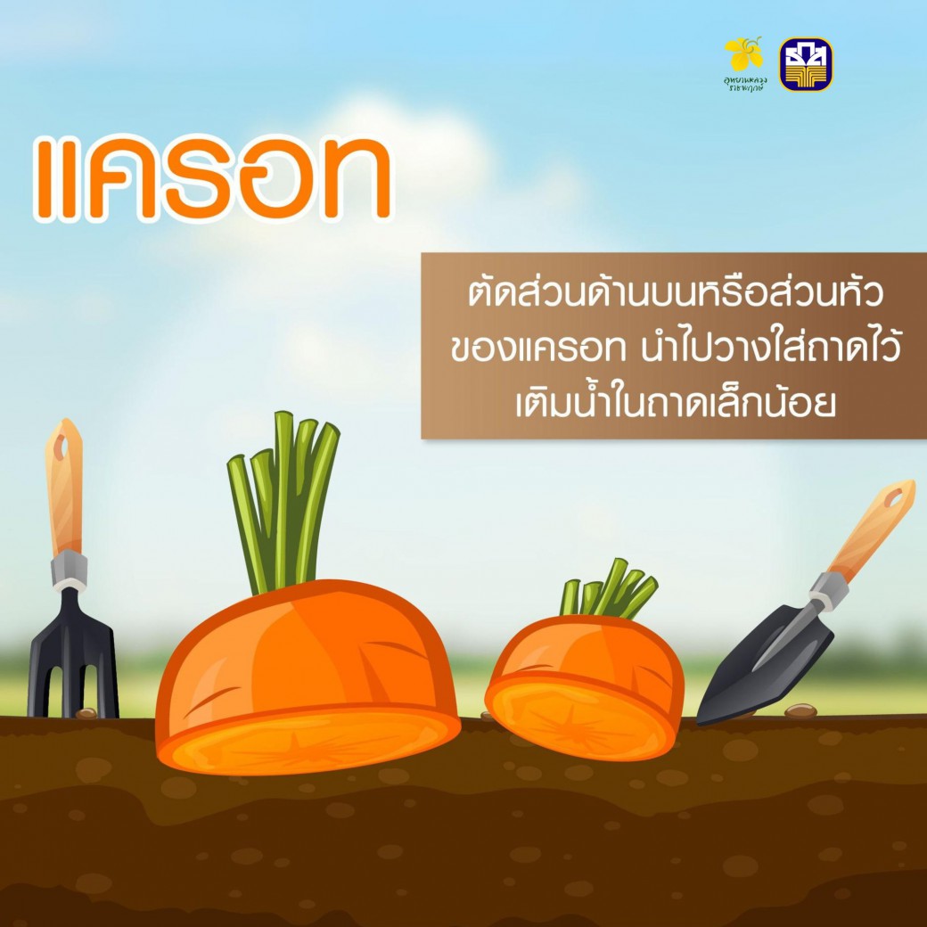 ใช้วิธีตัดส่วนด้านบนหรือส่วนหัวของแครอท แล้วนำไปวางใส่ถาดไว้ เติมน้ำลงไปเล็กน้อย เท่านี้ใบก็จะเริ่มแตกยอดใหม่ออกมาให้เห็น