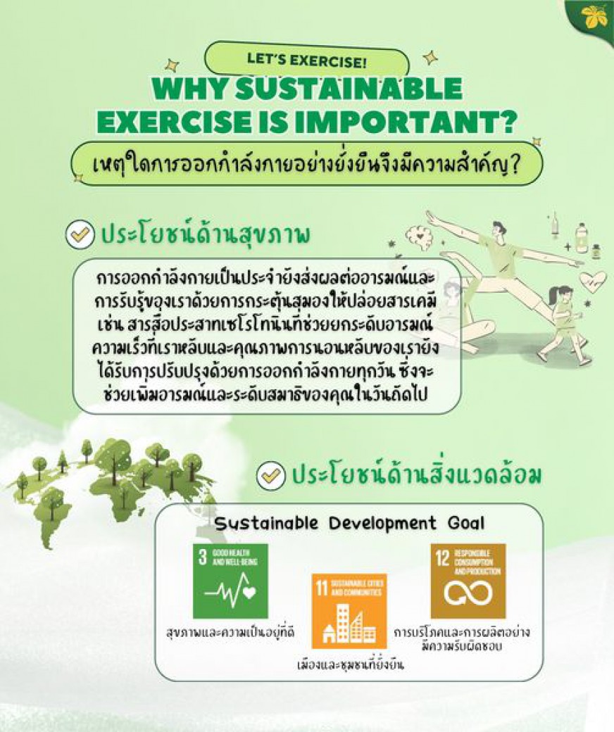 การออกกำลังกายอย่างยั่งยืนจะช่วยให้บรรลุเป้าหมาย การพัฒนาที่ยั่งยืนของสหประชาชาติ (UN Sustainable Development Goals) บางข้อ เช่น