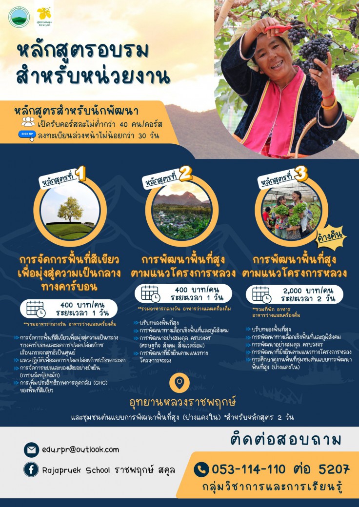 มีทั้งหลักสูตรอบรม 1 วัน และ 2 วันที่ได้ลงพื้นที่ดูงาน ในพื้นที่ต้นแบบของการพัฒนาพื้นที่สูงอีกด้วย