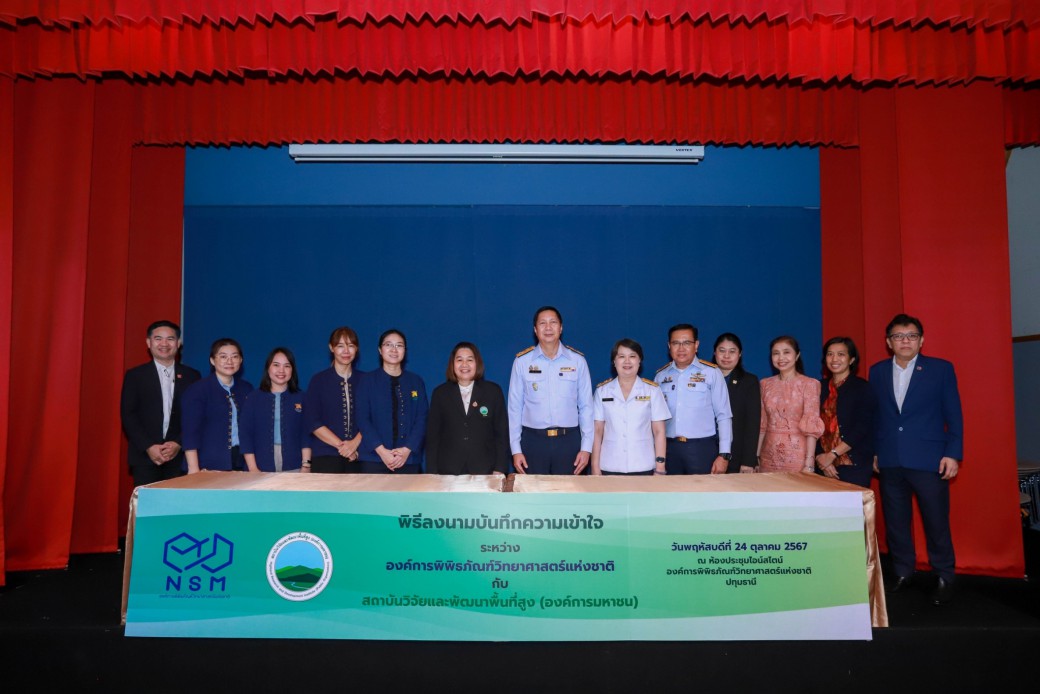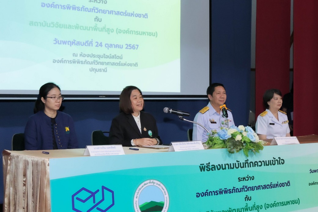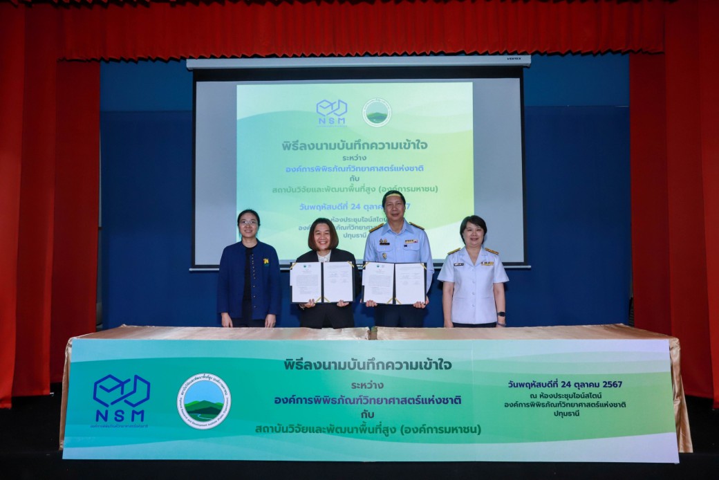 เมื่อวันที่ 24 ตุลาคม 2567 สถาบันวิจัยและพัฒนาพื้นที่สูง (องค์การมหาชน) หรือ สวพส. ร่วมกับองค์การพิพิธภัณฑ์วิทยาศาสตร์แห่งชาติ (อพวช.) ลงนามบันทึกความเข้าใจด้านวิชาการ มุ่งพัฒนาพื้นที่แหล่งเรียนรู้และจัดกิจกรรมส่งเสริมด้านวิทยาศาสตร์และสิ่งแวดล้อมสำหรับเยาวชน โดยมี ผศ.ดร.รวิน ระวิวงศ์ ผู้อำนวยการองค์การพิพิธภัณฑ์วิทยาศาสตร์แห่งชาติ (อพวช.) และนางสาวทินรัตน์ พิทักษ์พงศ์เจริญ ผู้อำนวยการอุทยานหลวงราชพฤกษ์ สถาบันวิจัยและพัฒนาพื้นที่สูง (องค์การมหาชน) ได้ร่วมลงนามบันทึกความเข้าใจด้านวิชาการ เพื่อบูรณาการความร่วมมือในการพัฒนาพื้นที่แหล่งเรียนรู้และส่งเสริมกิจกรรมด้านวิทยาศาสตร์และสิ่งแวดล้อม ณ ห้องไอน์สไตน์ อพวช. ตำบลคลองห้า อำเภอคลองหลวง จังหวัดปทุมธานี