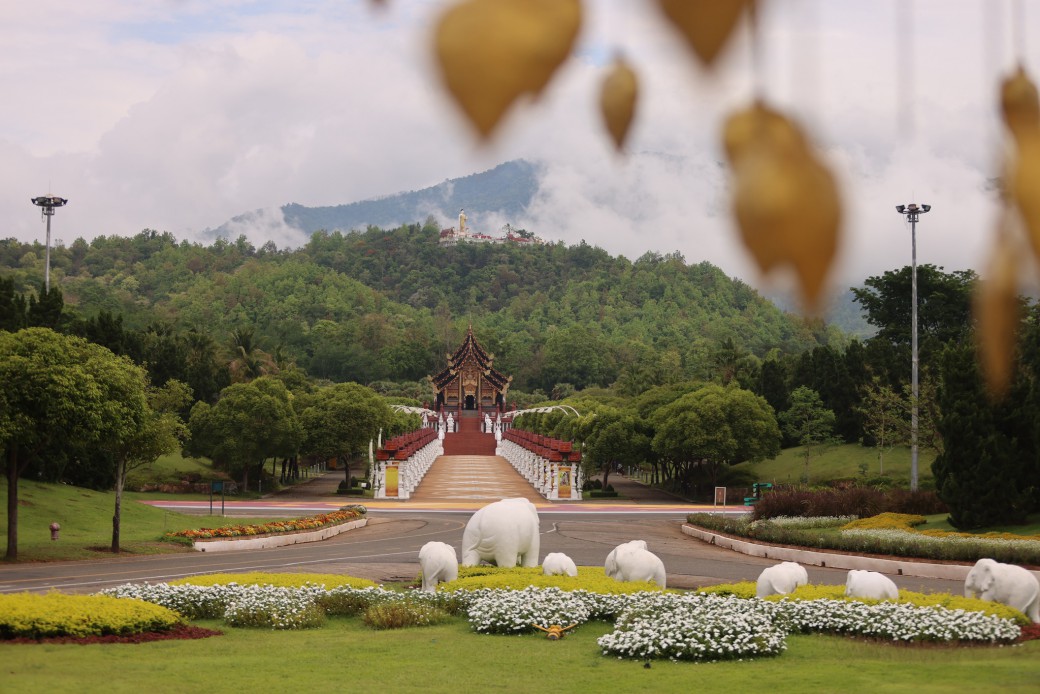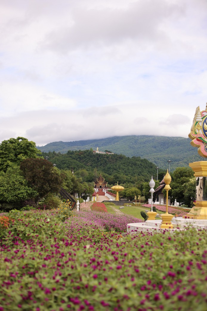 ღ ชมสวนลานต้อนรับ ตั้งแต่จุดต้อนรับยาวไปจนถึง หอคำหลวง เต็มไปด้วยดอกไม้หลากสีสัน ท่ามกลางหมอกจางๆ และวิวภูเขา