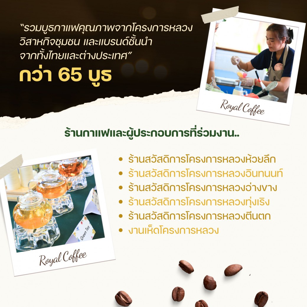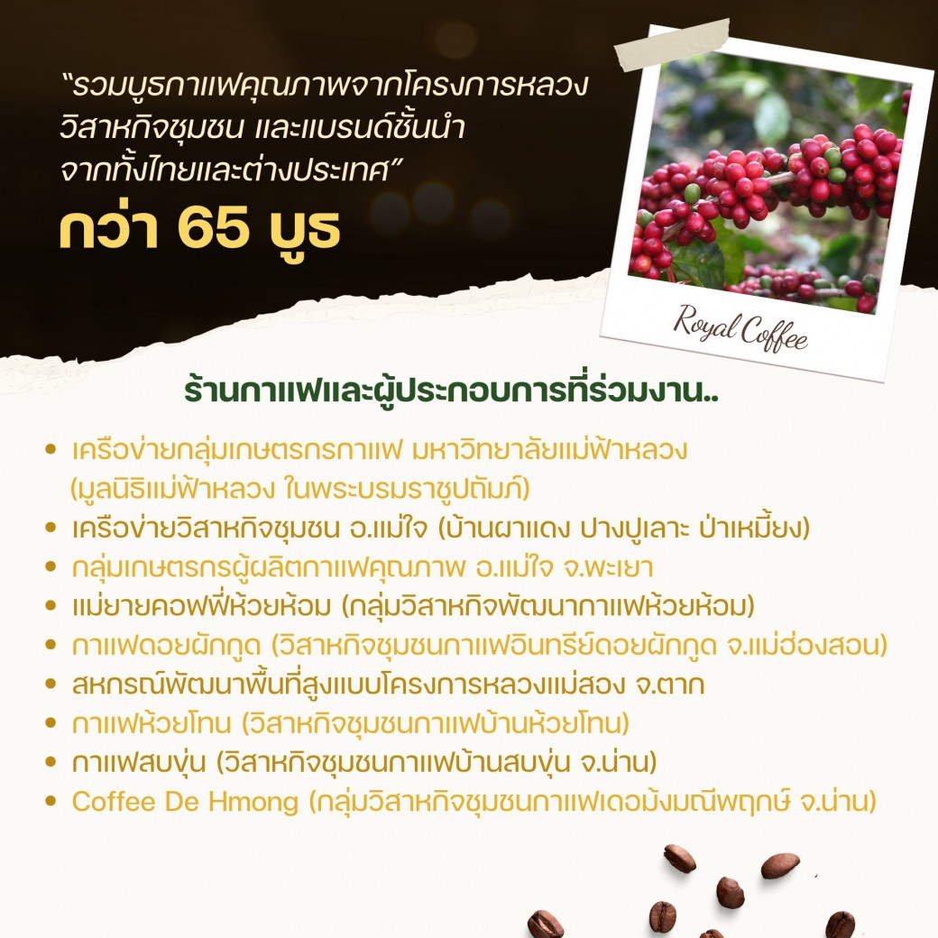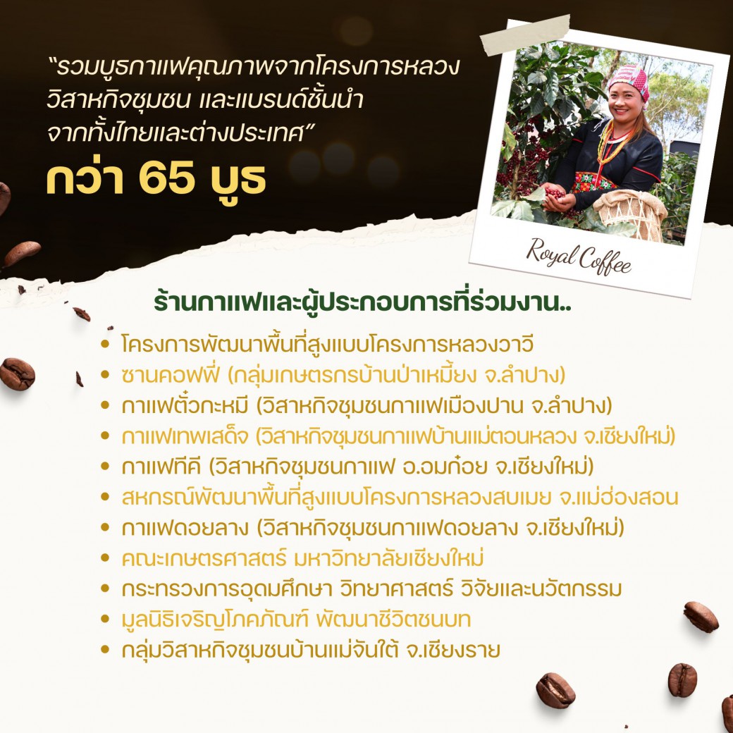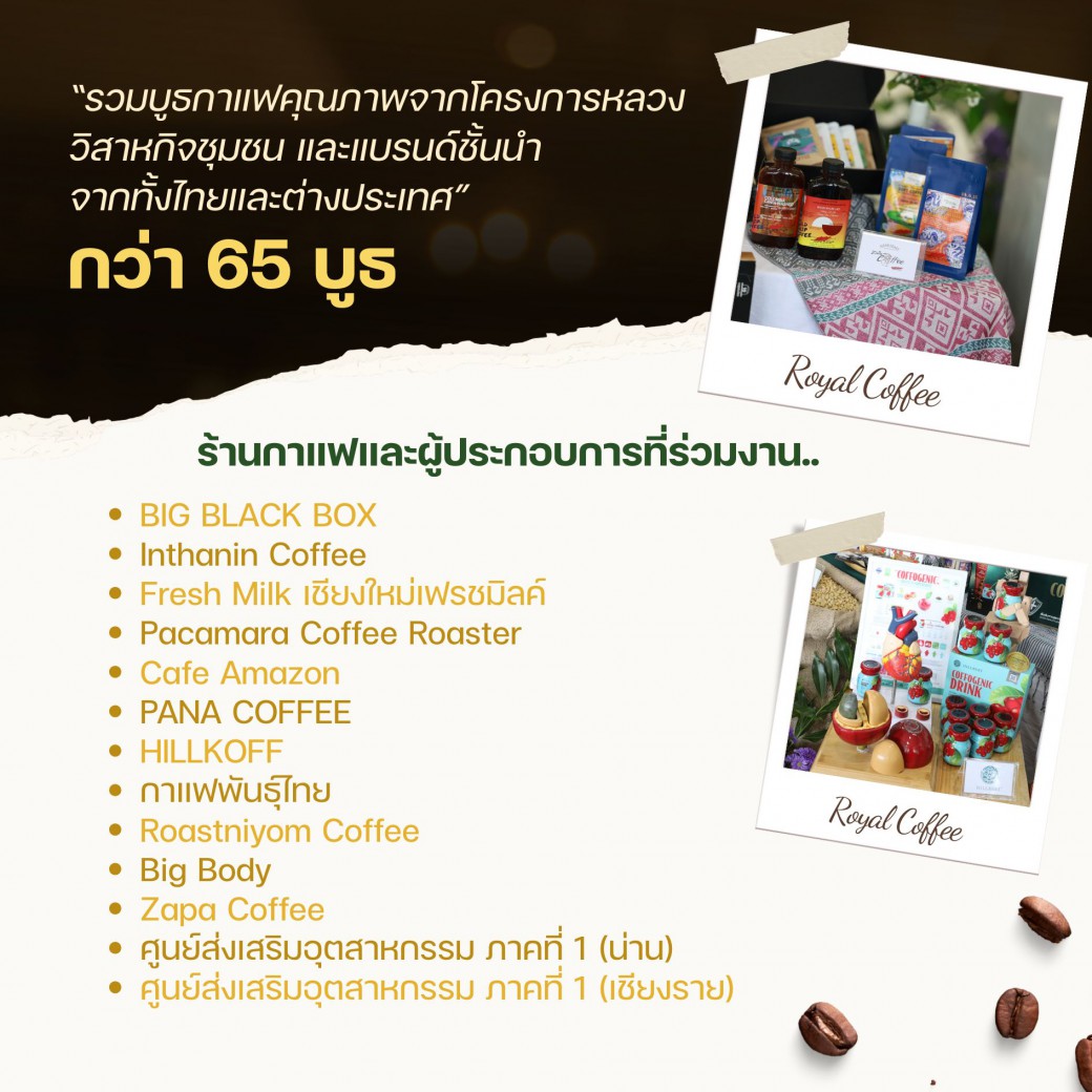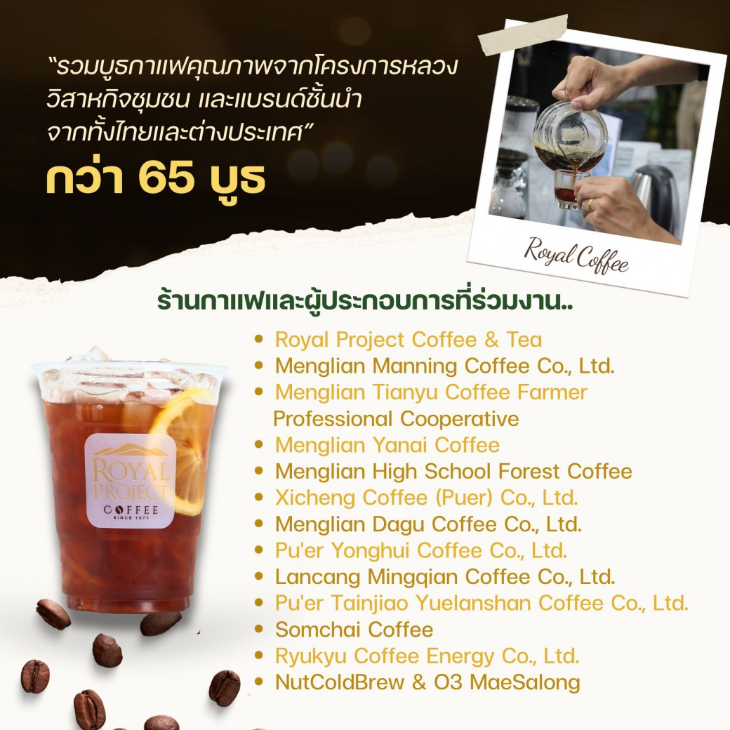 ✦ รวมบูธกาแฟคุณภาพจากโครงการหลวง วิสาหกิจชุมชน และแบรนด์ชั้นนำจากทั้งไทยและต่างประเทศ พร้อมกิจกรรมแลกเปลี่ยนความรู้ และสร้างเครือข่ายระหว่างเกษตรกร ผู้ประกอบการ และภาคีเครือข่ายกว่า 65 บูธ