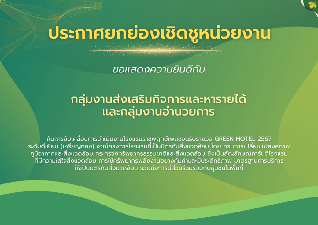 ✦ขอแสดงความยินดีกับ “กลุ่มงานส่งเสริมกิจการและหารายได้และกลุ่มงานอำนวยการ” กับการขับเคลื่อนการดำเนินงานโรงแรมราชพฤกษ์เพลซจนรับรางวัล Green Hotel 2567 ระดับดีเยี่ยม (เหรียญทอง) จากโครงการโรงแรมที่เป็นมิตรกับสิ่งแวดล้อม โดย กรมการเปลี่ยนแปลงสภาพภูมิอากาศและสิ่งแวดล้อม กระทรวงทรัพยากรธรรมชาติและสิ่งแวดล้อม ซึ่งเป็นสัญลักษณ์การันตีโรงแรมที่มีความใส่ใจสิ่งแวดล้อม การใช้ทรัพยากรพลังงานอย่างคุ้มค่าและมีประสิทธิภาพ มาตรฐานการบริการให้เป็นมิตรกับสิ่งแวดล้อม รวมถึงการมีส่วนร่วมร่วมกับชุมชนในพื้นที่