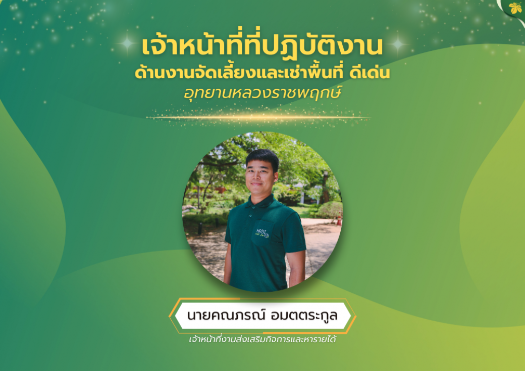 ✦ ขอแสดงความยินดีกับ “นายคณภรณ์ อมตตระกูล เจ้าหน้าที่งานส่งเสริมกิจการและหารายได้” ที่ได้รับคะแนนโหวตสูงสุดในการปฏิบัติงานด้านงานจัด เลี้ยงและเช่าพื้นที่ดีเด่นของอุทยานหลวงราชพฤกษ์