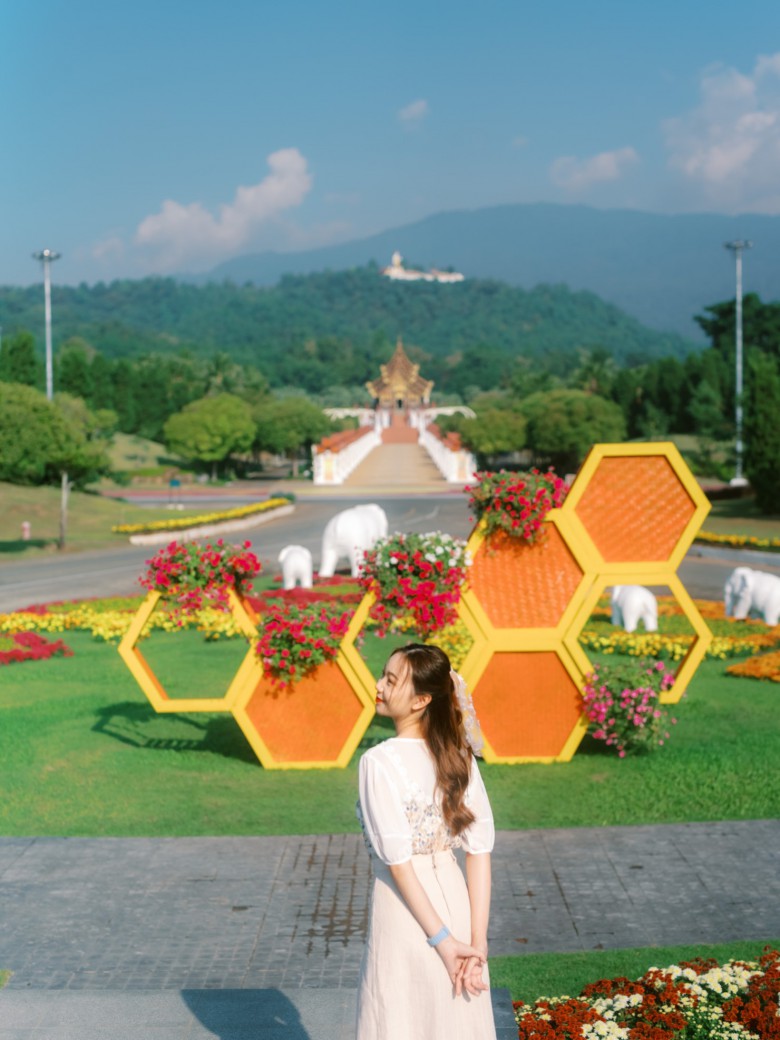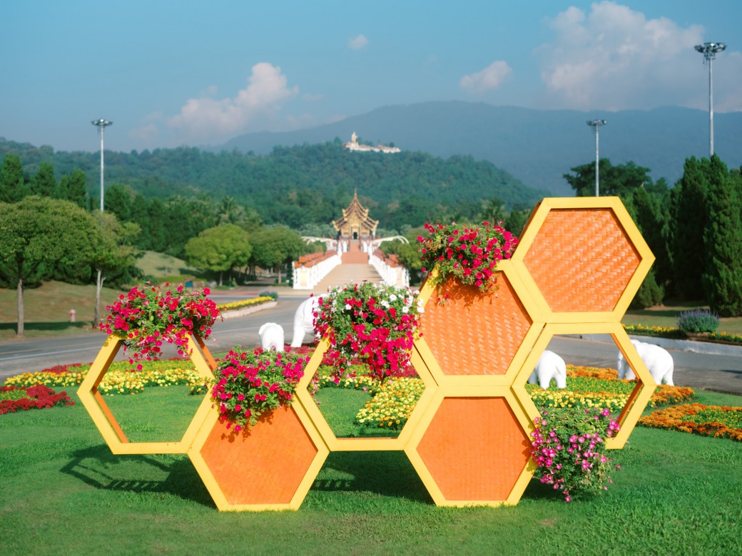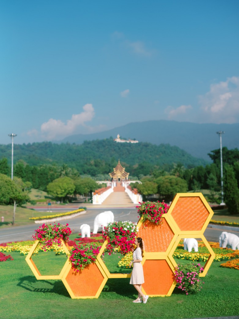 แบคดรอปรังผึ้งขนาดใหญ่ โดดเด่นสวยงาม ถ่ายรูปได้วิวหอคำหลวง ตกเเต่งมุมดอกไม้เป็นลวดลายของรังผึ้งอีกด้วย มุมนี้ถ่ายเเล้ว สวยสุดๆ พลาดไม่ได้เเล้วจ้า
