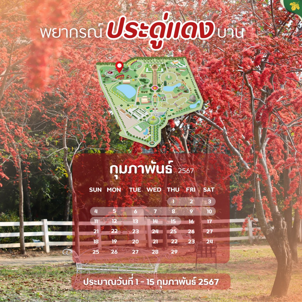 ประดู่แดง เป็นไม้กลุ่มสีกลุ่มแรกที่เริ่มผลิบาน ดอกสีแดงสวยสดงดงาม และพยากรณ์ความสวยว่าจะเริ่มทยอยบานในช่วงวันที่ 1-15 กุมภาพันธ์ 2567 ต้อนรับเทศกาลตรุษจีนและวาเลนไทน์ ซึ่งช่วงนี้ต้นประดู่แดงเริ่มออกช่อดอกเล็กๆมาทักทายบ้างแล้วจ้า