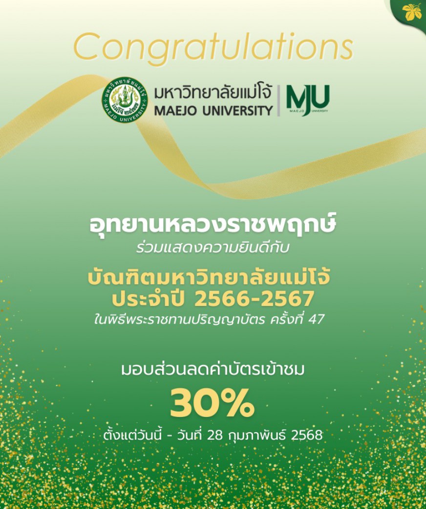 ▶อุทยานหลวงราชพฤกษ์ ขอร่วมแสดงความยินดีกับบัณฑิตมหาวิทยาลัยแม่โจ้ทุกท่าน ขอมอบส่วนลดค่าบัตรเข้าชม 30%
